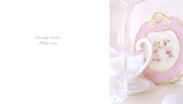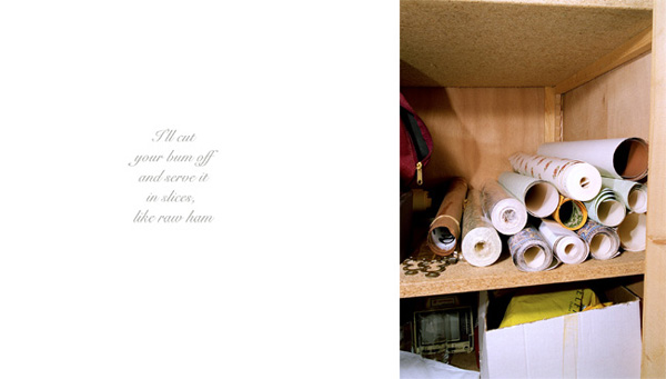 Colour photographs of my mother’s tidy cupboards together with excerpts from my father’s rantings.